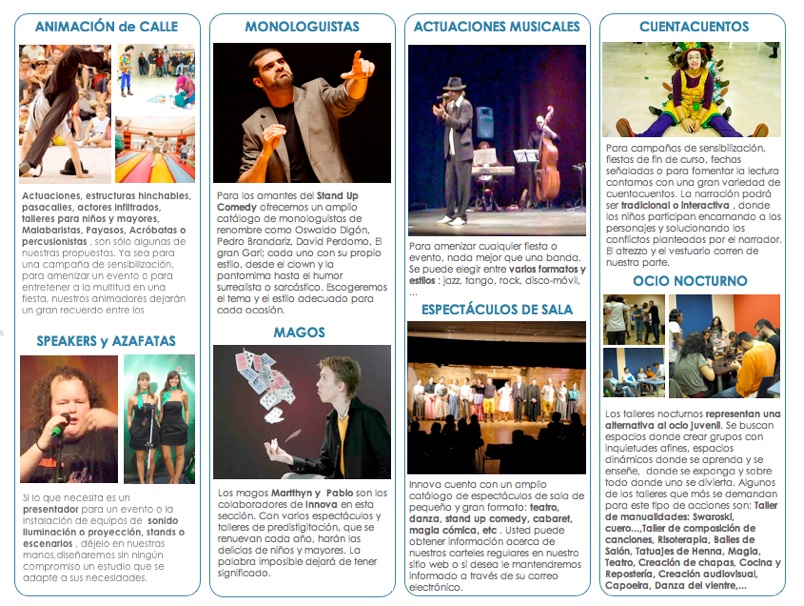 Innova dispone de un amplio catálogo para de servicios de animación así como espectáculos de sala y calle. Si quiere recibir más información o un presupuesto detallado por favor cubra el formulario que aparece a continuación: